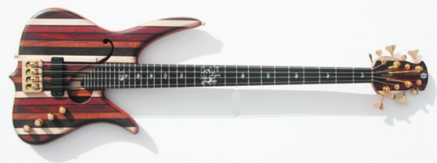 Surine Basses decided to go all out on their Regency model with this “Rainbow” 8-string bass. The hollow-body bass has a stunning 39-strip laminate top and matching headstock with a variety of exotic woods. Equally impressive is the 7-piece thru neck made of rock maple and purple heart, which is topped by an ebony fingerboard. And if that’s not enough, the fingerboard has intricate mother of pearl inlays with a larger lion inlay at the 12th fret. The pickup and electronics are made by Bartolini, and the bass’s gold hardware includes a Hipshot detuner on both E strings.